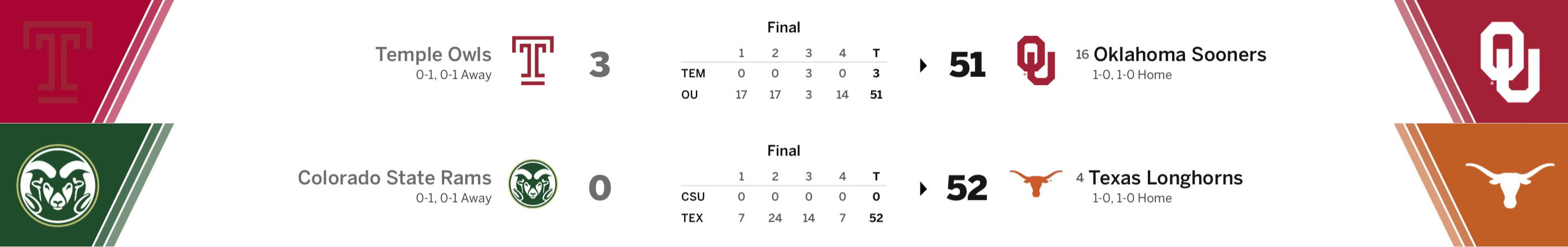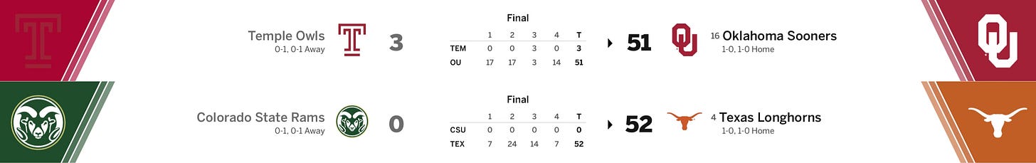 What’s changed? New teams in new conferences. Oklahoma and Texas played their first games as members of the SEC on Friday and Saturday, respectively, and each had a pretty easy time (against non-conference inferior opponents).