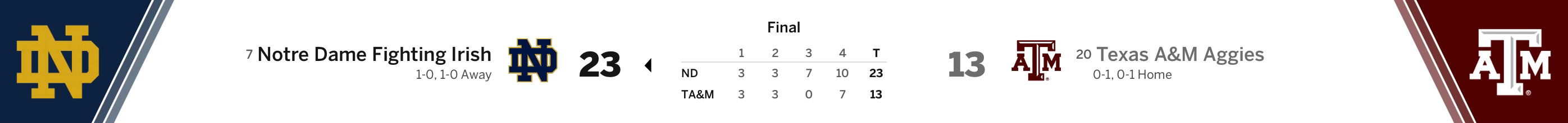 And in the game of the day, #7 Notre Dame spoiled the opening game for new #20 Texas A&M head coach Mike Elko, pulling away in the second half to win 23-13.