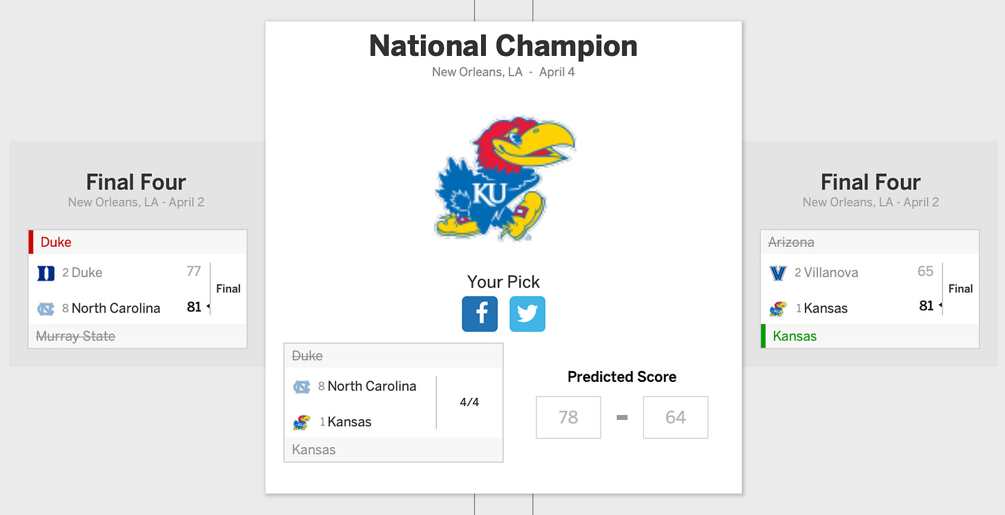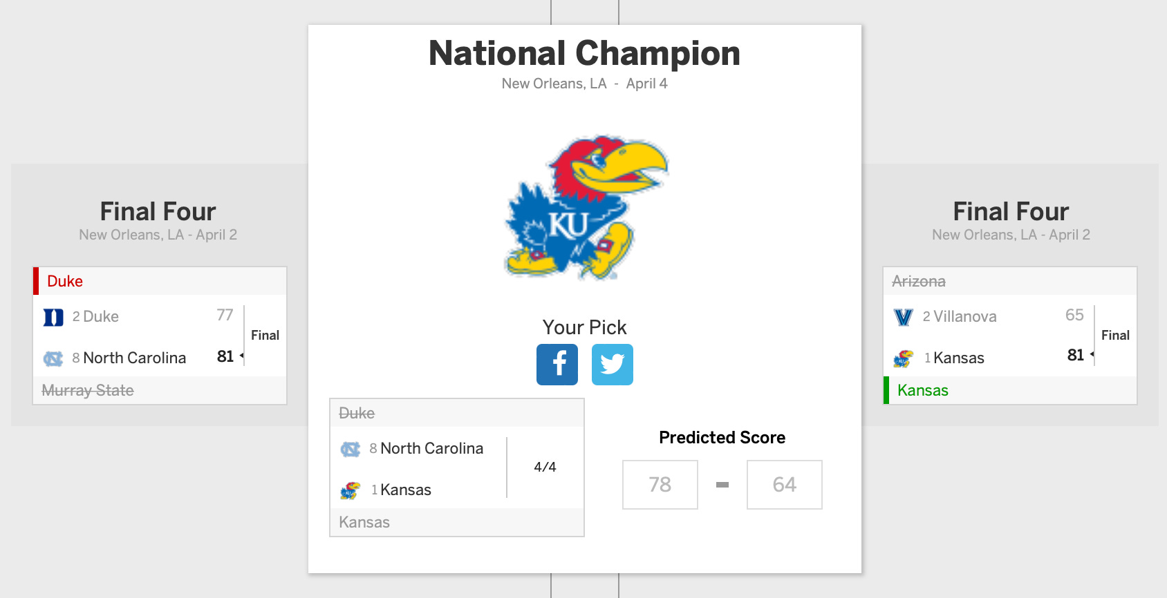 In the end, if the Jayhawks can stay efficient for one more game, I can’t see them being beat by anybody, much less North Carolina. I have Kansas beating North Carolina 84-77 and winning their fourth National Championship and first since 2008. You should also go take a look at my bracket because before the tournament started, I did have Kansas winning the National Championship. Just saying. The National Championship game tips off on Monday night at 9:20 pm et on TBS.
