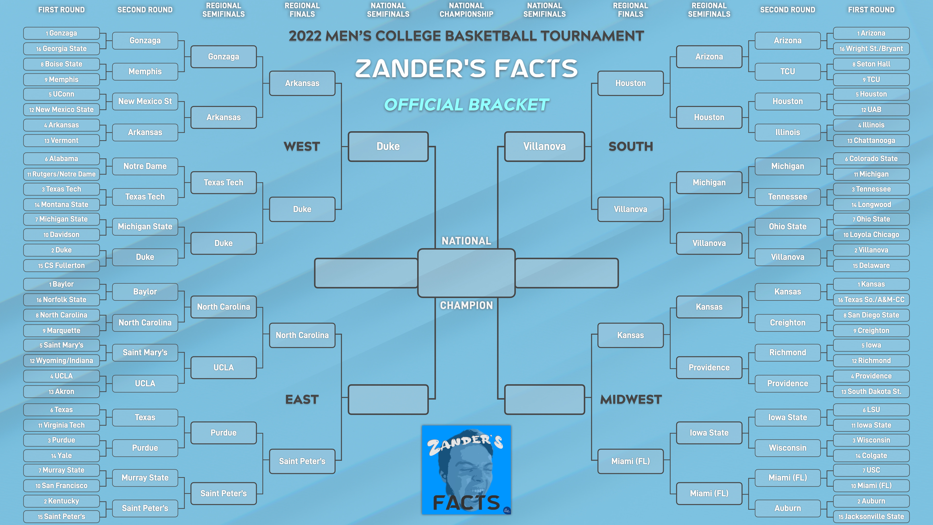 Also, you should go listen to Episode 57 of the Zander’s Facts Podcast! From two weeks ago, Zander’s Facts’ bracket aficionado Andrew joined the pod as he and I unveiled our tournament brackets. There were a ton of facts about all the teams that you will want to know. Plus, check out how my Final Four picks are holding up. Download and listen to the Zander’s Facts Podcast wherever you get your podcasts!