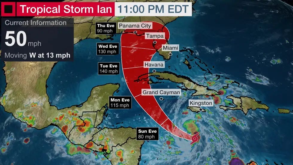 The storm is expected to move into significantly warmer waters by Monday, strengthening into a Category Four hurricane. The cone of uncertainty currently puts the U.S. mainland in Ian’s path beginning on Wednesday. While the storm may weaken by that point, it could still be bringing top winds well over 100 mph, with major hurricane status.