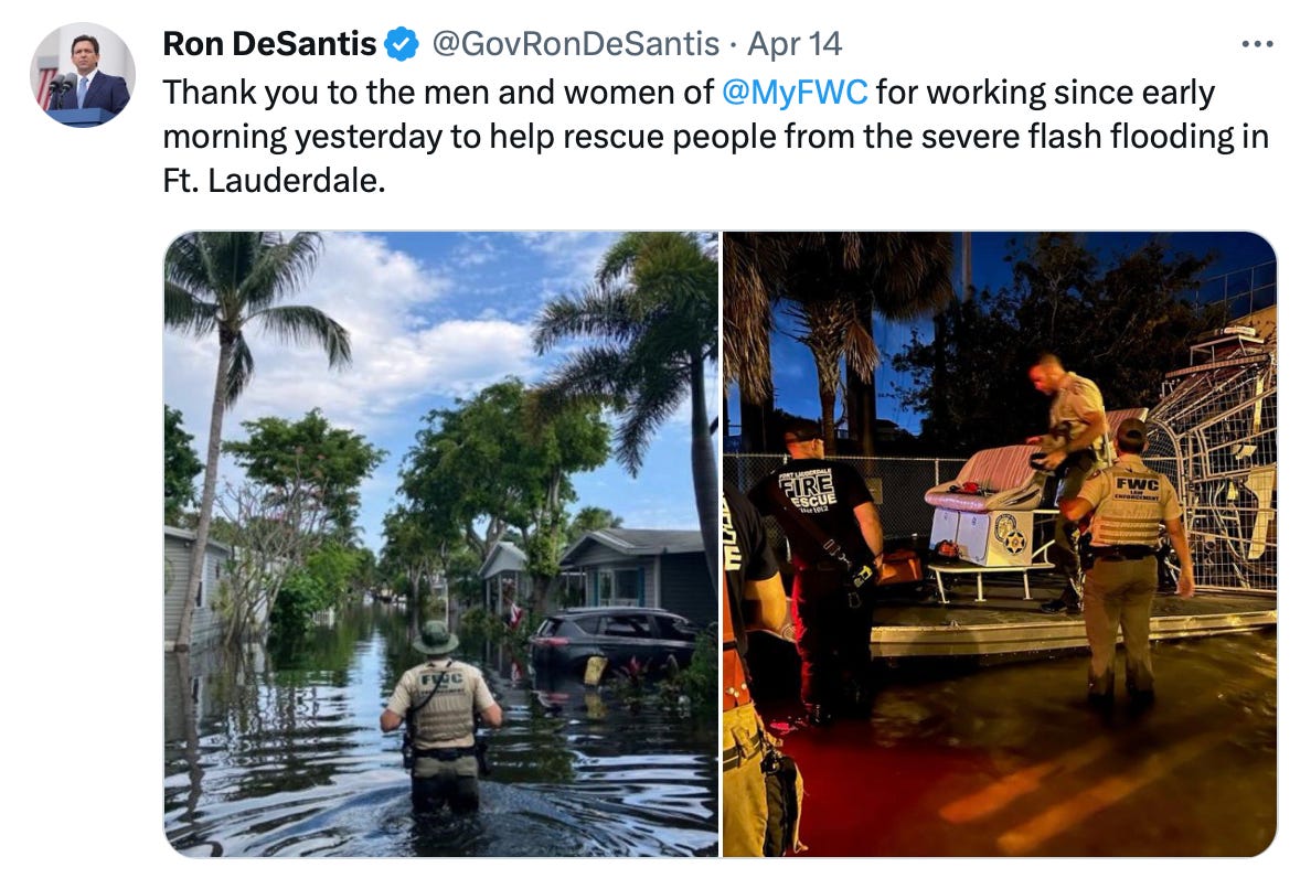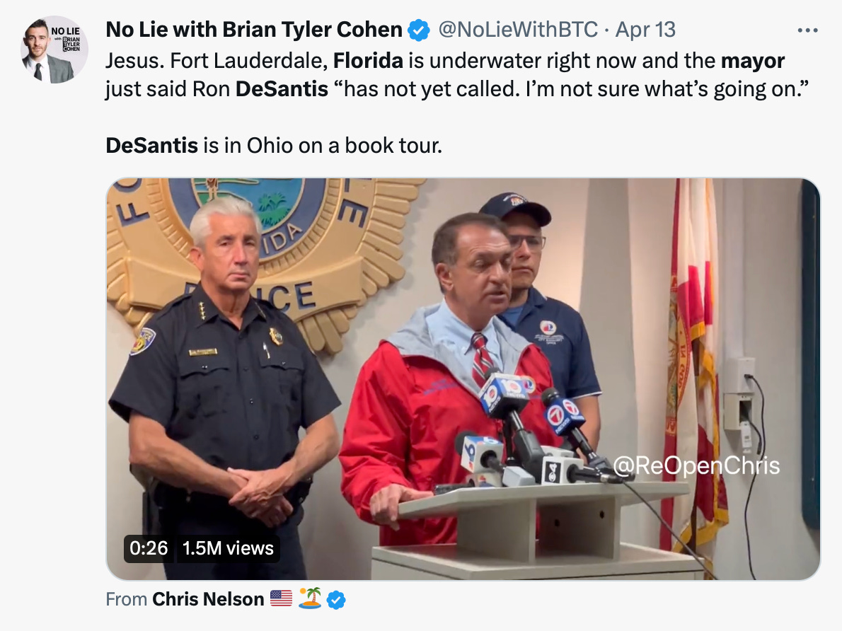 But on Thursday, one day after the floodwaters began rising, Fort Lauderdale Mayor Dean Trantalis was asked whether the Governor of Florida, Ron DeSantis, has been in contact with the locality hit by the historic rainfall:
