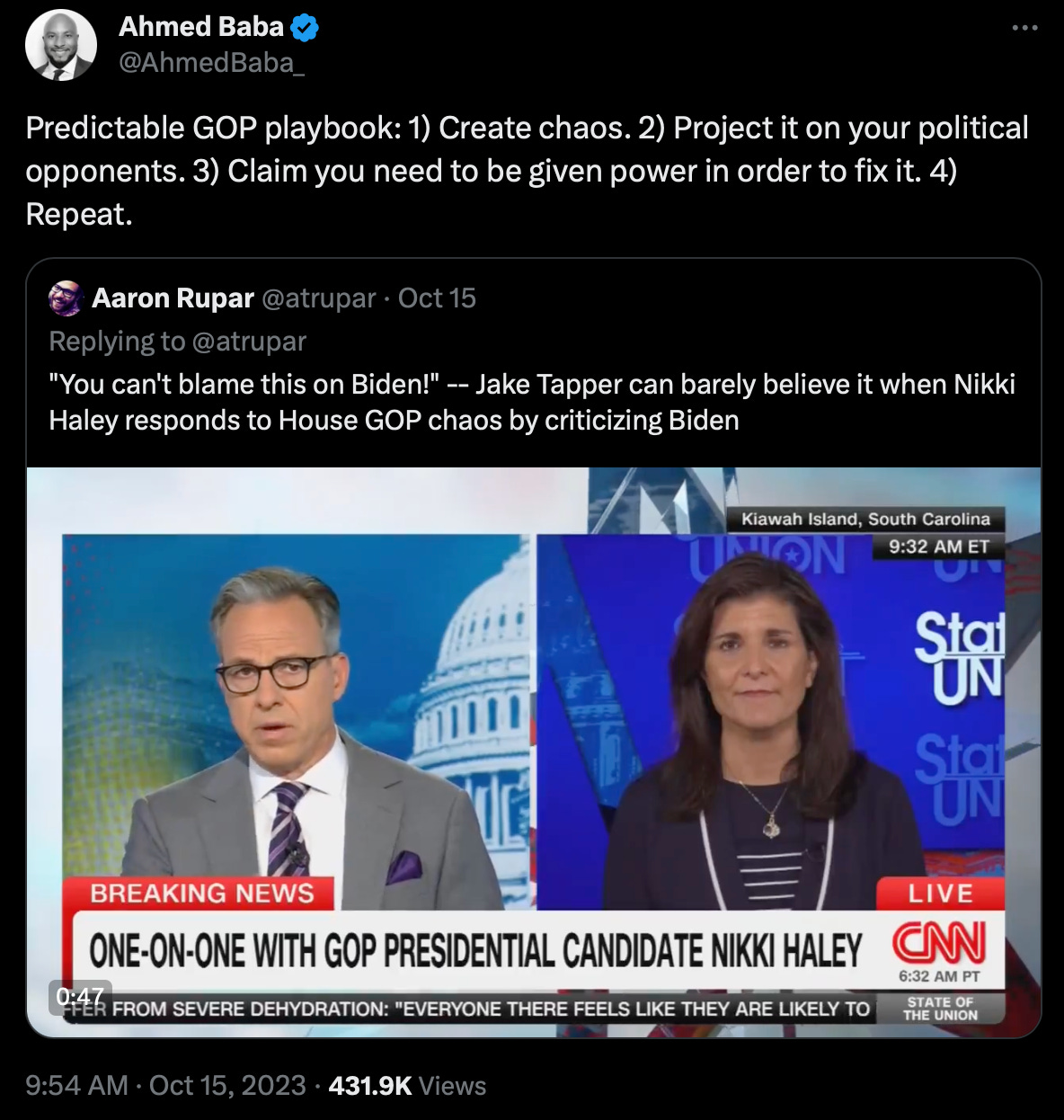 But remember that Rep. Matt Gaetz (R-FL) made the motion to oust McCarthy because he got Democratic votes on a bill to avert a government shutdown. (Which McCarthy then criticized Democrats for on CBS’ Face The Nation the next day, the reason why he didn’t get any Democratic support in the House vote to remove him.) So it doesn’t appear that Republicans are hungry to negotiate with Democrats on anything. (Even if it means the government stays stagnant, solely because of their ineptitude.)